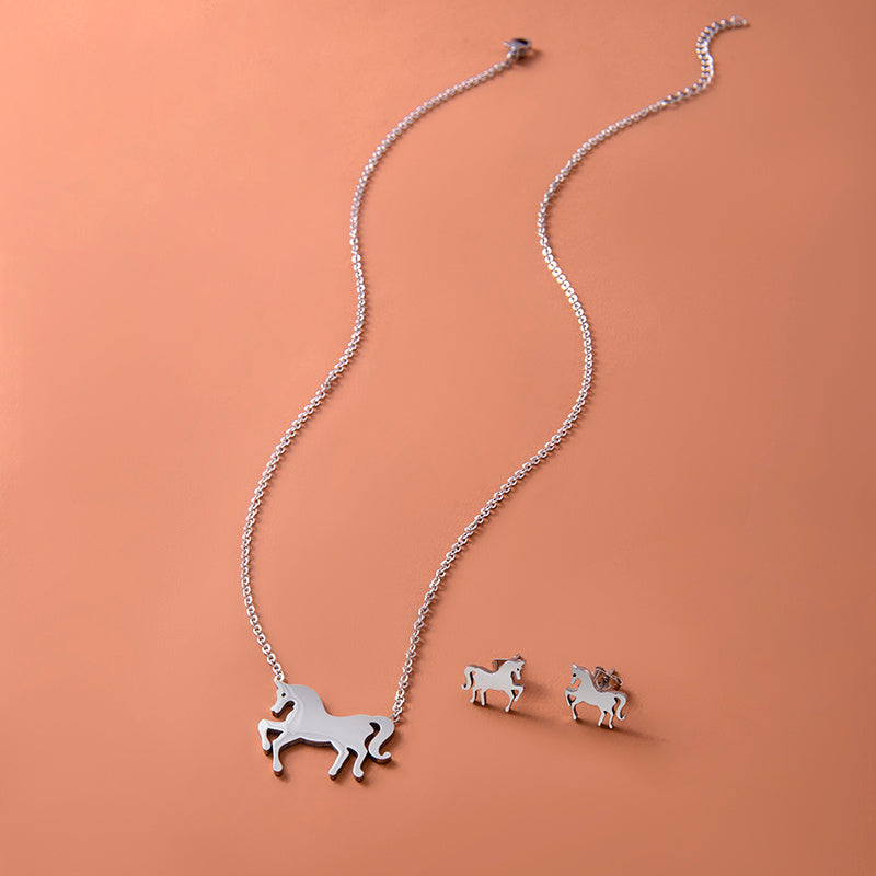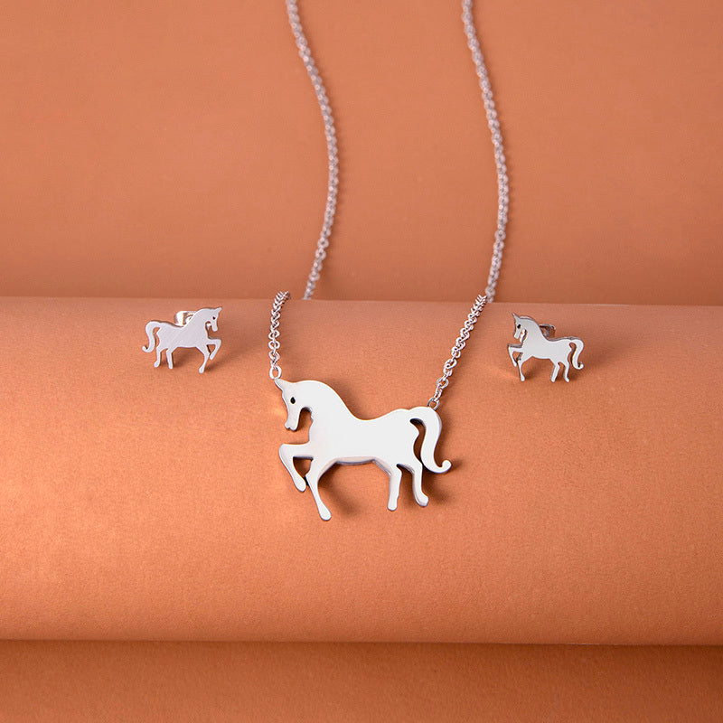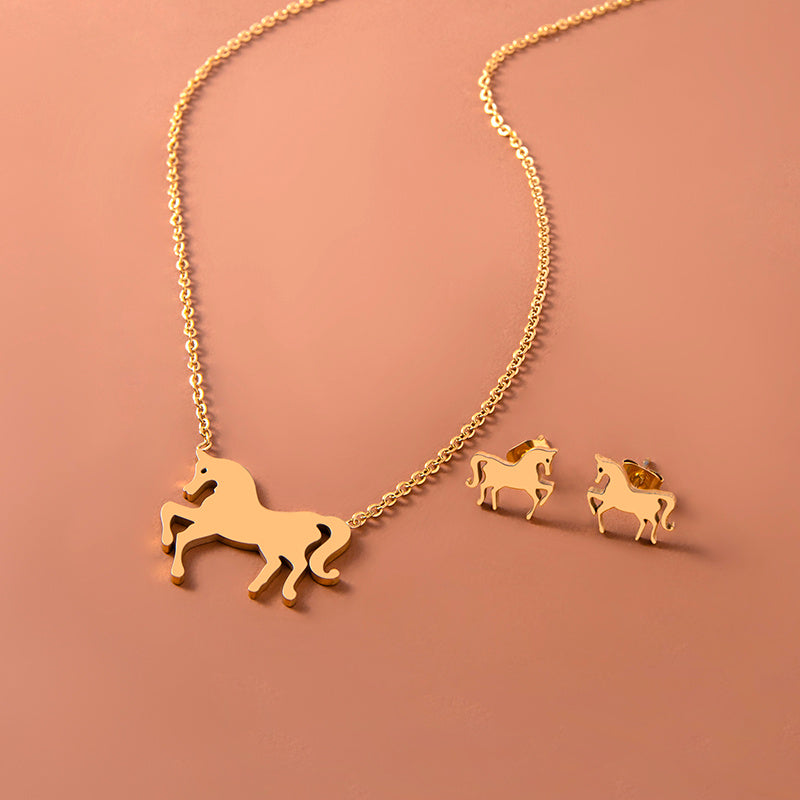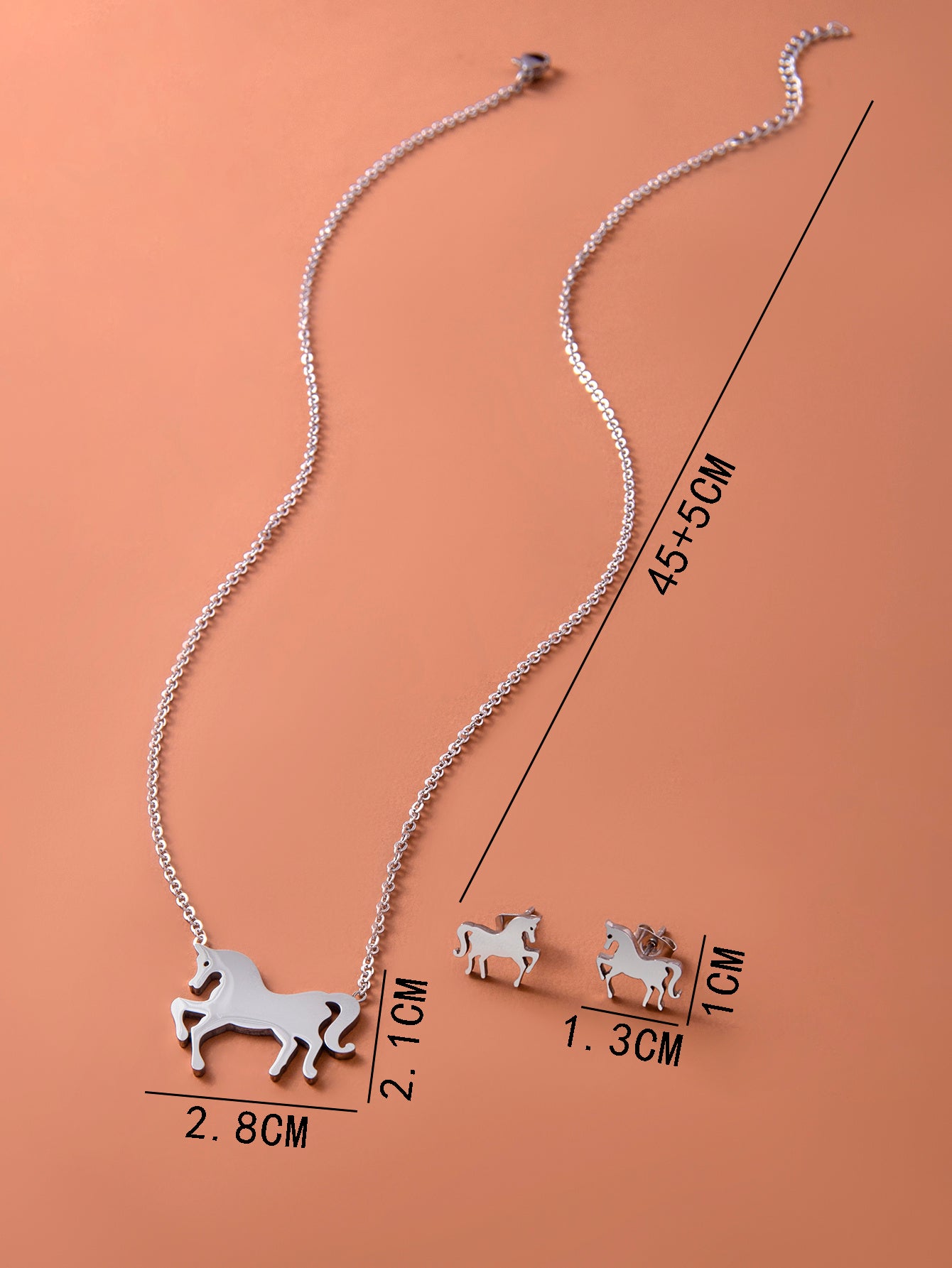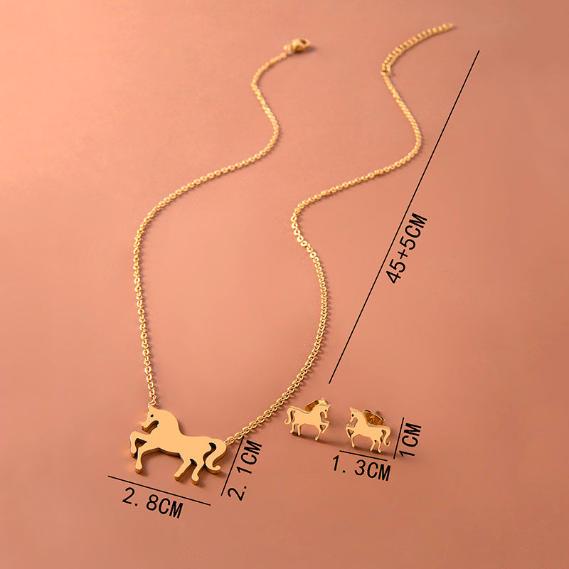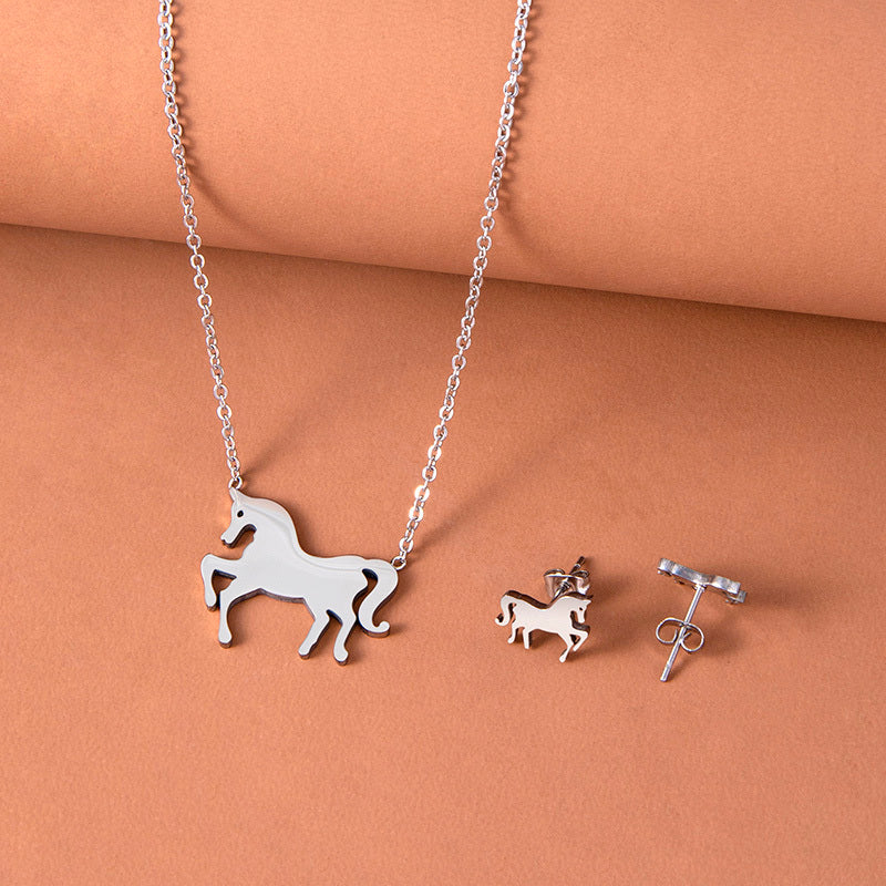 Stainless Steel Gold Silver Unicorn Horse Necklace Earrings Jewelry Set